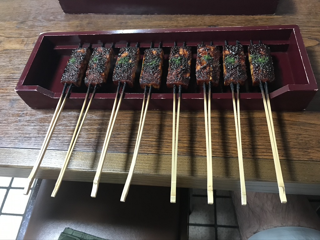 松野屋 さんと言う田楽(豆腐を串に刺して、甘い味噌をつけて焼いたやつ、、