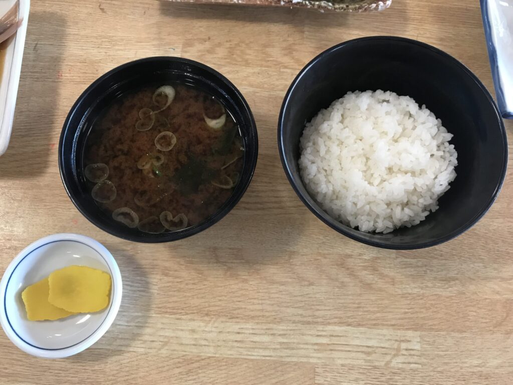 そして、お味噌汁とご飯、お漬物です。