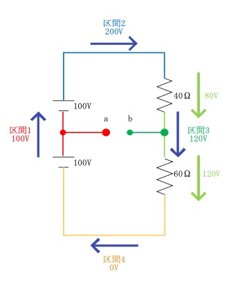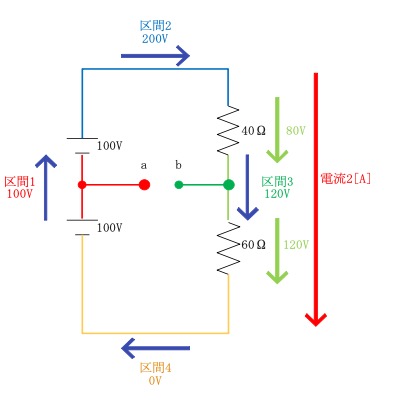 ということは、上下どちらの抵抗にも同じ電圧がかかることになり、区間1-区間2-区間4の経路には100[V]の電圧がかかっているので、抵抗にかかる電圧は各50[V]となります。(合計100[V])