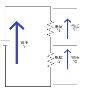 分電圧とは、直列に接続した複数の抵抗それぞれに加わる電圧のことです。右記の回路の電圧V[V]の時、抵抗R1,R2の電圧V1,V2は以下となります。