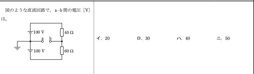 このことより、4[Ω]にかかる電圧は40[V],6[Ω]にかかる電圧は60[V]となります。