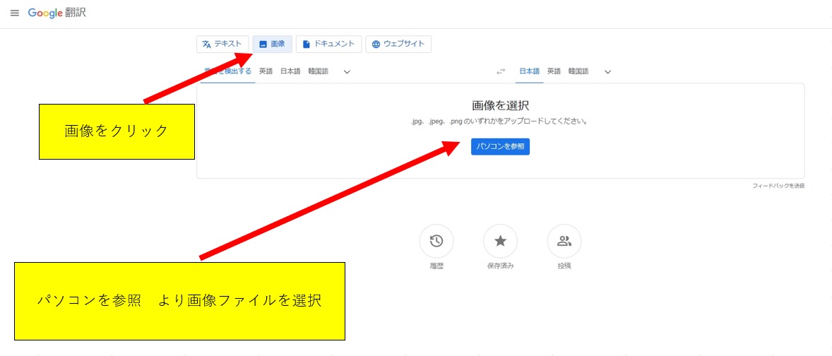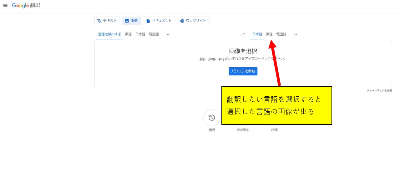 画像ファイルを選択すると翻訳された言語にて画像が表示されます。翻訳したい言語は 画像を選択枠の上部中央付近にある言語をクリックすることで選択できます。