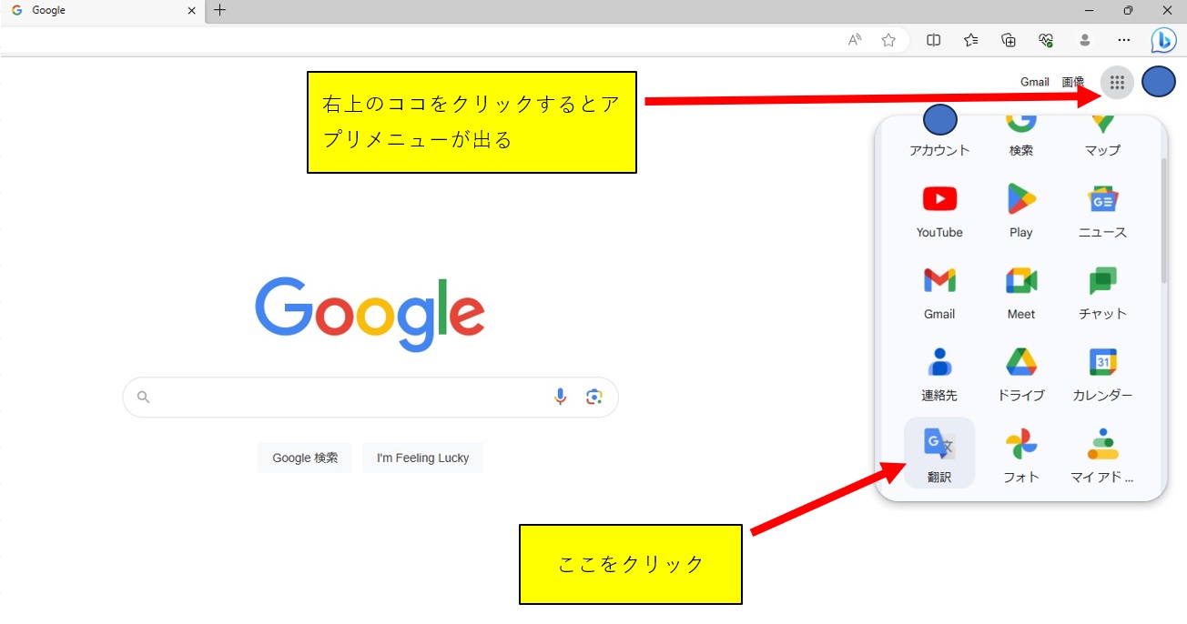 Googleのページの右上より、Googleアプリ をクリックし その内の 翻訳 をクリックします。