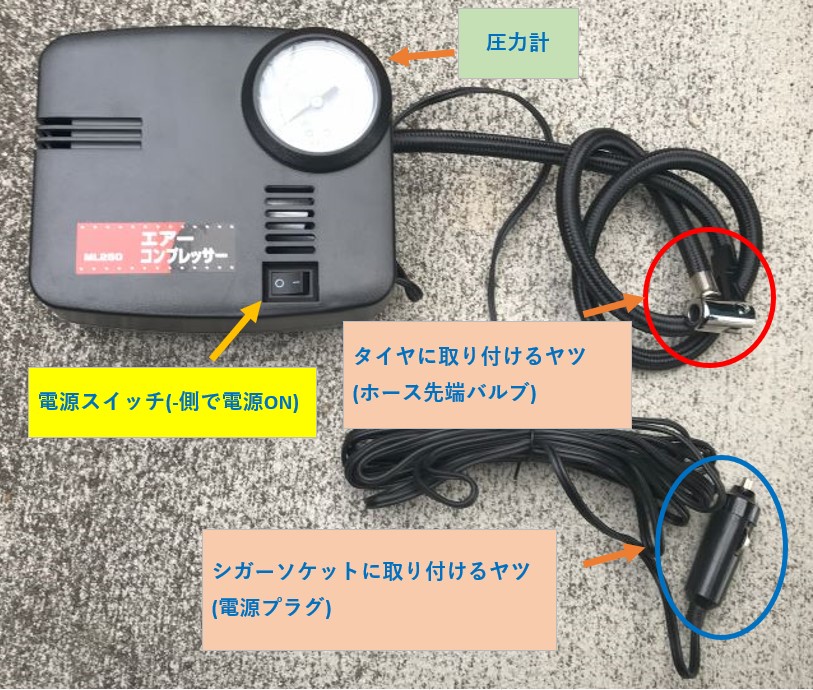 ・全タイヤの空気圧を入れたら、シガーソケットの電源プラグを抜く