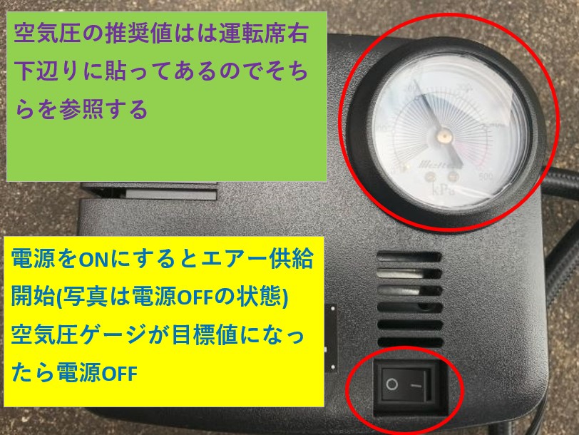 ・空気圧を常時確認しながら指定の空気圧になったら電源スイッチをOFFにする