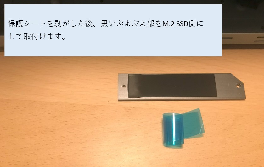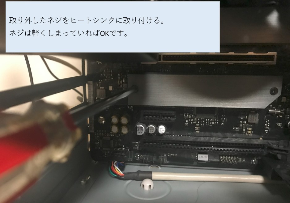 黒い色のぷよぷよする面をM2.SSD側に合わせて、2か所のネジ止めをします。この時にネジをあまり強い力で締めすぎないように注意してください。