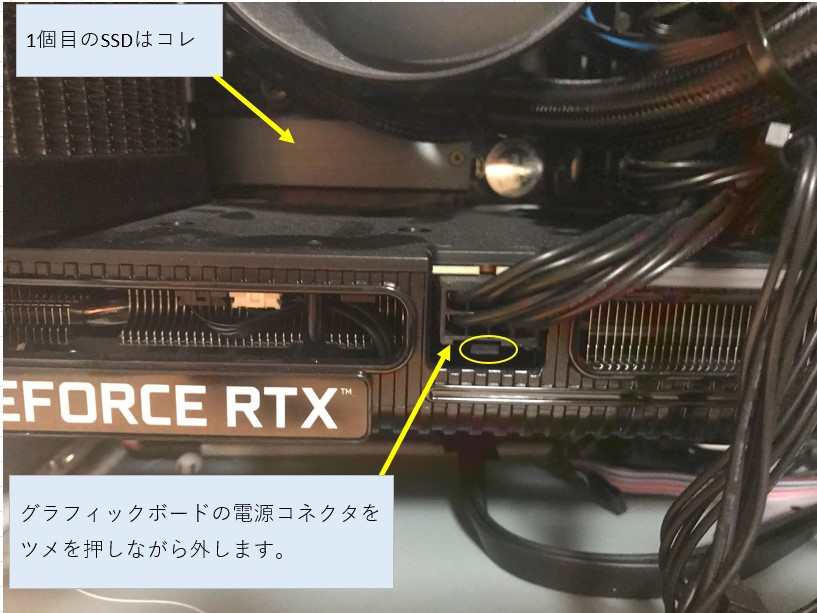 グラフィックボードに接続されている電源ケーブルをツメを押しながら抜きます。