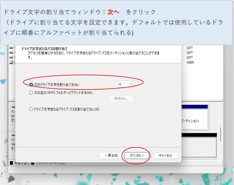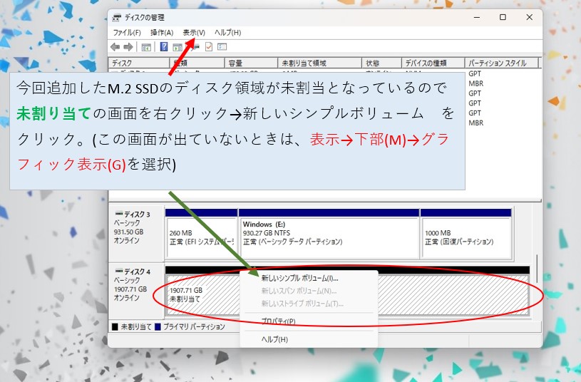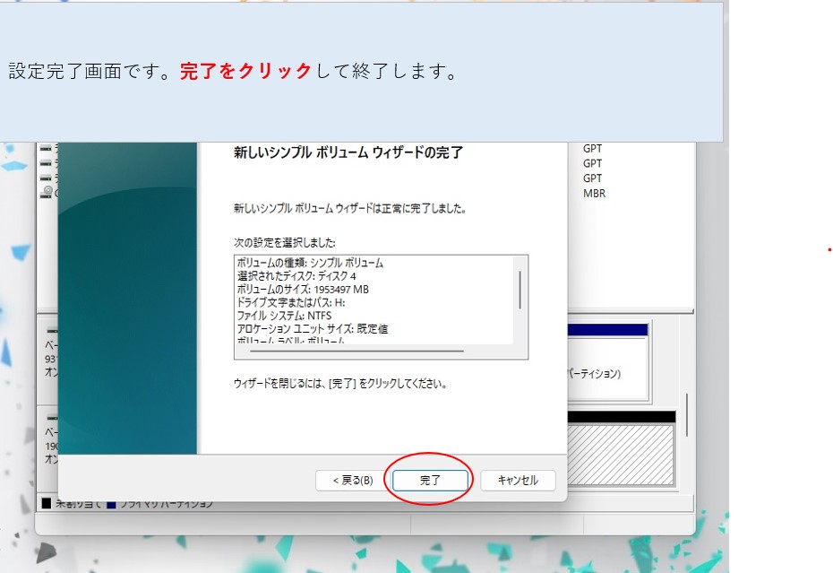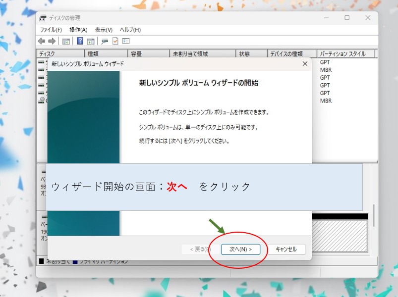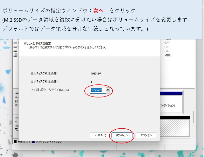 新しいシンプルボリュームウィザードが出るので、基本的にはずっと 次へ ボタンを押していき、最後に 完了 ボタンを押せば割り当て完了となり、晴れて追加したM.2 SSDが使用可能となります。