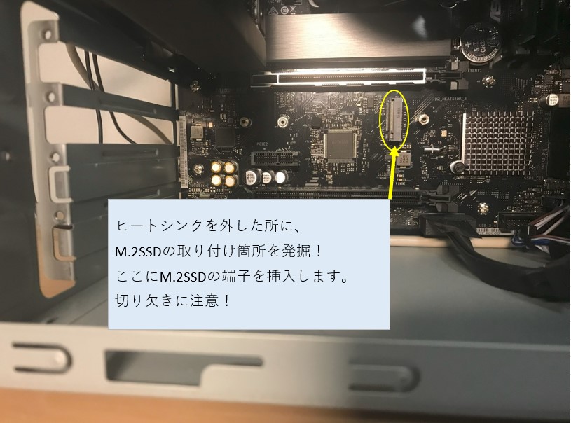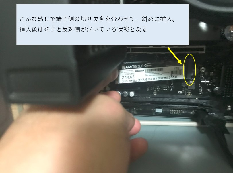 ヒートシンクを外すと見えてくる M.2 SSD 差し込み用端子に M.2 SSDの端子を合わせて、差し込みます(ちょっぴり斜めに差し込まれていればOK)。