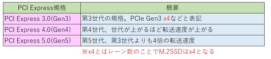 PCI Expressの規格もバージョンによって種類があります。パソコンに搭載されているM.2 SSDスロットのPCI Expressのバージョンを確認しておきましょう。