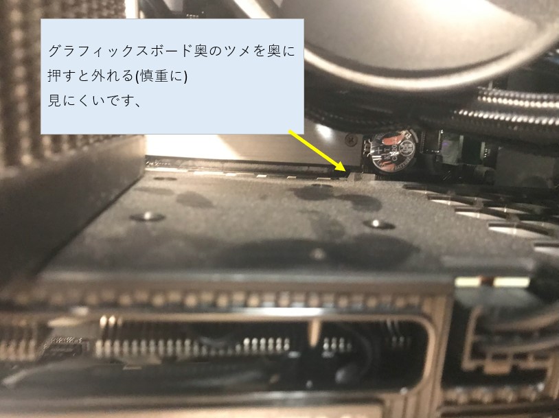 グラフィックボードの奥にあるツメをマイナスドライバーなどで注意しながら押し下げるとグラフィックスボードが外れます。押し下げる時、他部分をキズつけないよう慎重に!