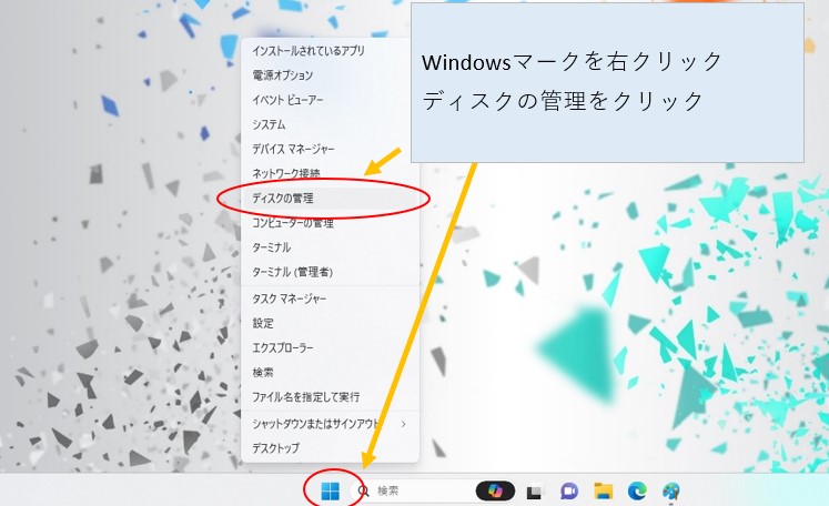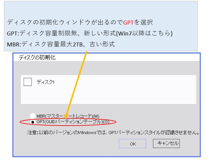 パソコンを立ち上げたらWindowsマークを右クリックし、ディスクの管理をクリックします。ディスクの初期化ウィンドウが出るので、GPTを選んでOKを押します。
