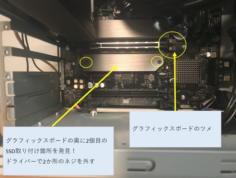 ・M.2 SSDの取り付け箇所を確認します。、、結構ごちゃごちゃしているので、わからない場合はマザーボードの説明書を参照してください。今回はサイドパネルを外せばすぐに分かるだろうとお気楽に考えていたのですが、いざ開けてみると、、、。場所が分からない、、。1個目のSSD場所はわかるのですが、もう片方が、、。ということでマザーボードの説明書を見ました。分かりました!グラフィックボードの奥ですね、、。最悪、。