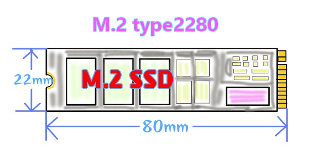 M.2 SSDは、パソコンのマザーボードに直接差し込んで取り付けるタイプのものです。大きさにより3種類ありますが、以下に示す 2280 という規格のものがパソコン用としてはほとんどです。