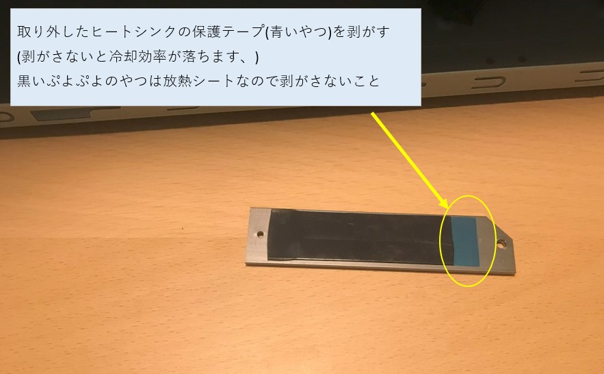 ヒートシンクの裏側に保護テープがついている場合は、テープをはがします。(ちなみに筆者は剥がし忘れて、そのままパソコン立ち上げてました😂 その時にふと思い出して、再度同じ作業をする羽目に、、。)