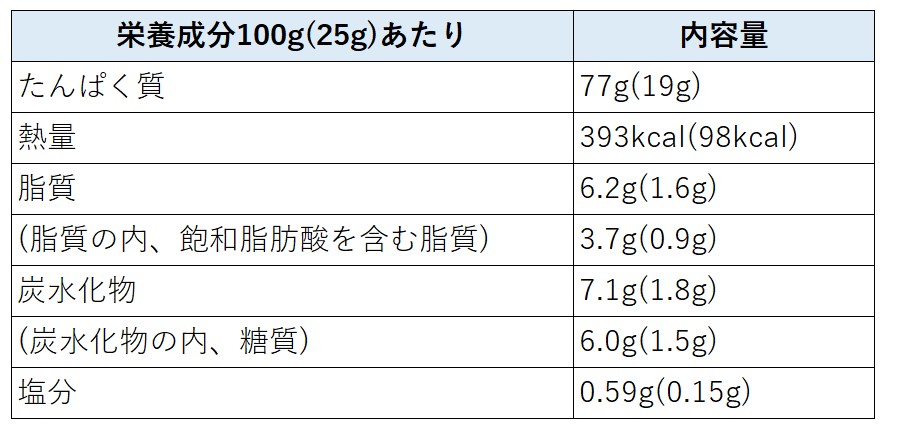 たんぱく質は 100g中77g とあり、マイプロテイン的には平均くらいですが、70%を軽く超えているのはさすがです😊