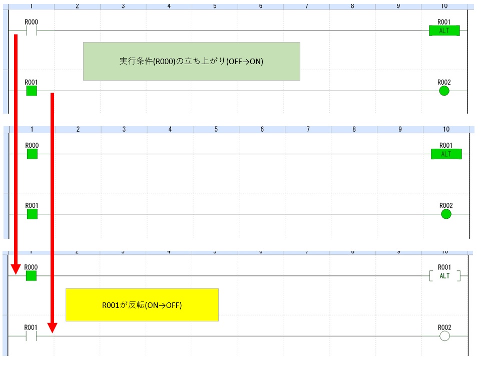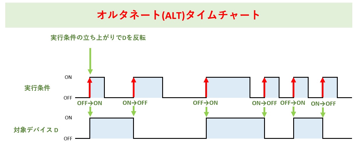 オルタネート命令は、指定したビットが実行条件の立ち上がりのたびに対象デバイスを反転(ONだったらOFF,OFFだったらON)します。