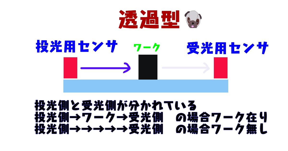 投光用センサと受光用センサをセットで使用します。動作の安定性が高い、検出距離が長い、ワークの形状、色、傾きなどの影響を受けにくい、といった特徴があります。