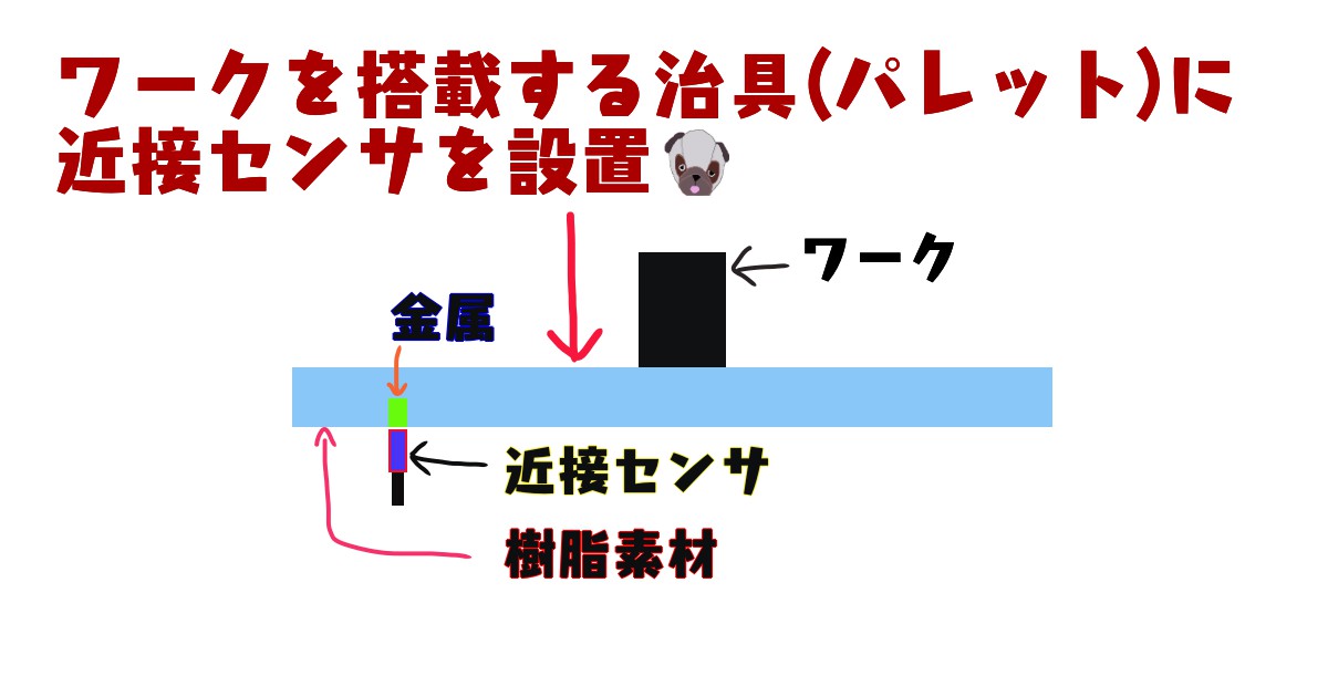 金属の特性を利用しているセンサで金属製ワークの検出専用となる。センサと金属の間に樹脂などの金属以外の物体があってもワーク有無を判別することが可能となっている。ワーク(自動処理対象物の意味)を直接判別するのに使用するのではなく、ワークを複数置いておく治具(パレット)の有無を検出する場合などに使用します。