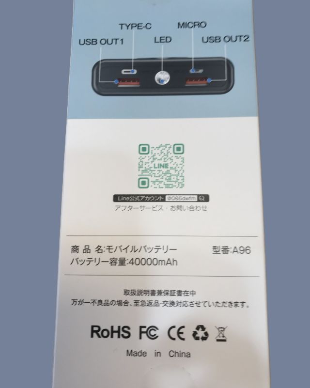 バッテリーの箱。USB Type-C対応、PSE認証済み品、一年保証がついています😊