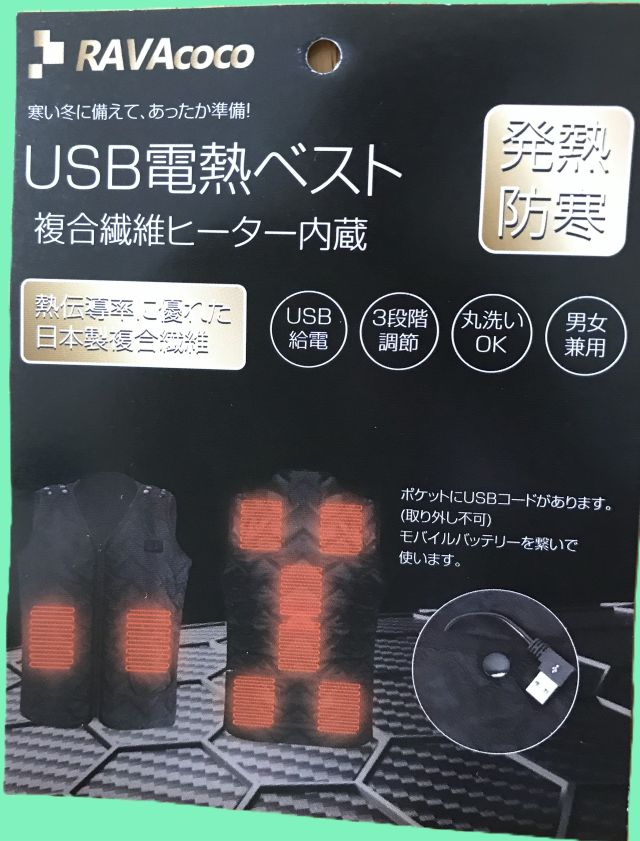 表はこんな感じ😄😄 サイドポケットにバッテリーを収納してUSBケーブルを接続して使用します。バッテリーが大きいのでポケットからはみ出ますが、、。よくみると糸が出ていたりしてます、まあ人にお見せするものではないので😄😄