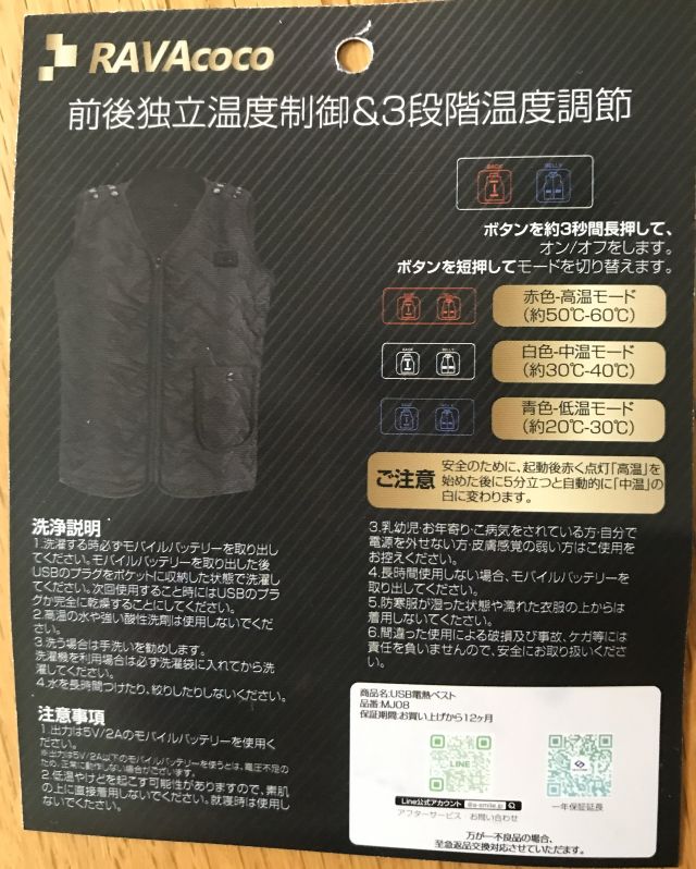 電熱ベストの説明書です。丸洗い可能ですが、USB端子部がむき出しなので本当に洗えるのちょっと心配😫😫